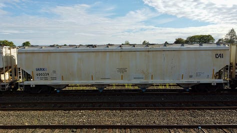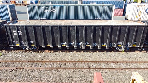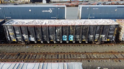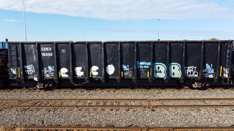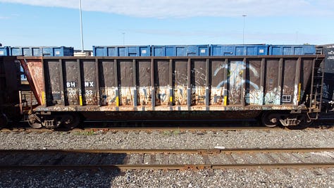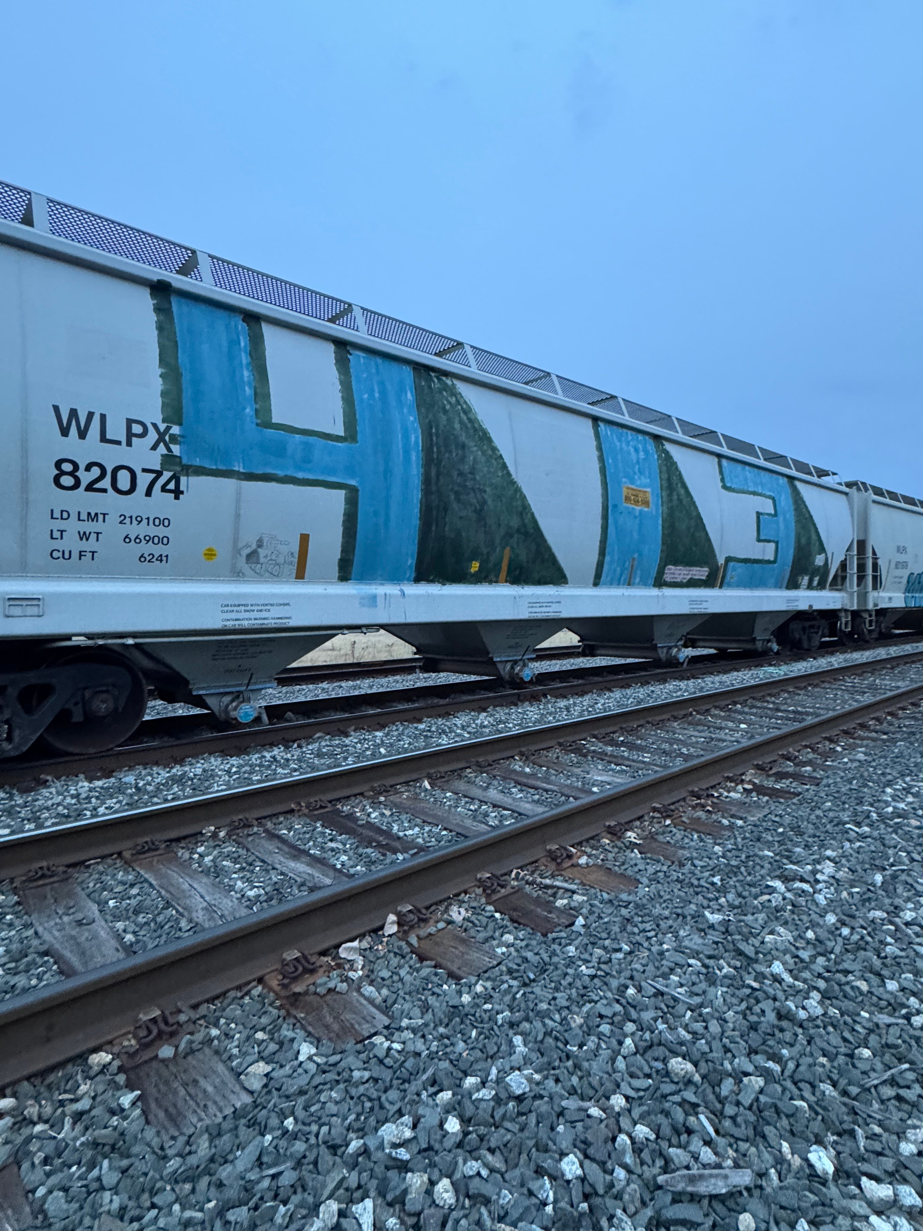 The 3rd hopper I painted was the night before work. I had a dark blue 1 gallon bucket of paint that I had been using for the main colors on these trains, but by this time I was down to the last little bit. I kept adding water & white to make it last a little but longer, but when I was in the field there was no thinning this paint down any further. I noticed by the time I got to the 3, this ratio of paint to water was way beyond repair. The paint appeared old & uneven. I wasn’t super happy about it & I hadn’t even added any 3D or depth to the numbers. This train took almost 4 hours because I had to keep going over it to make whatever paint I had stick to the cold metal surface. By the end of it, I had kinda given up & just said “We’ll get ‘em next time”.