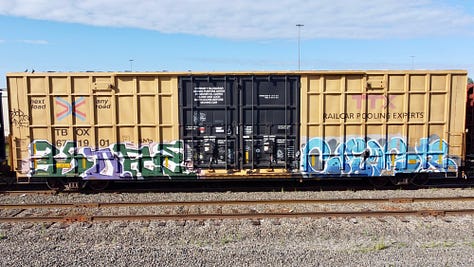 A week later, I ventured out to a train yard to paint another whole car the best I could. I got to my normal parking spot & I could hear a low humming noise coming from the tracks. I thought it may be a conductor car waiting to grab their load & head out. I figured it would be best to go all the way around so I took my duffle bag & all of my gear to head out for the 15-20 minute walk down the line to the same spot I was just at. This time, there was a ton of snow on the ground but that didn’t deter me from making my dreams come true. I found out later through another writer, that the low humming noise was actually a reefer that was on! A reefer is a refrigerated freight car & they are the holy grails of freight trains, in my opinion. But I digress,
